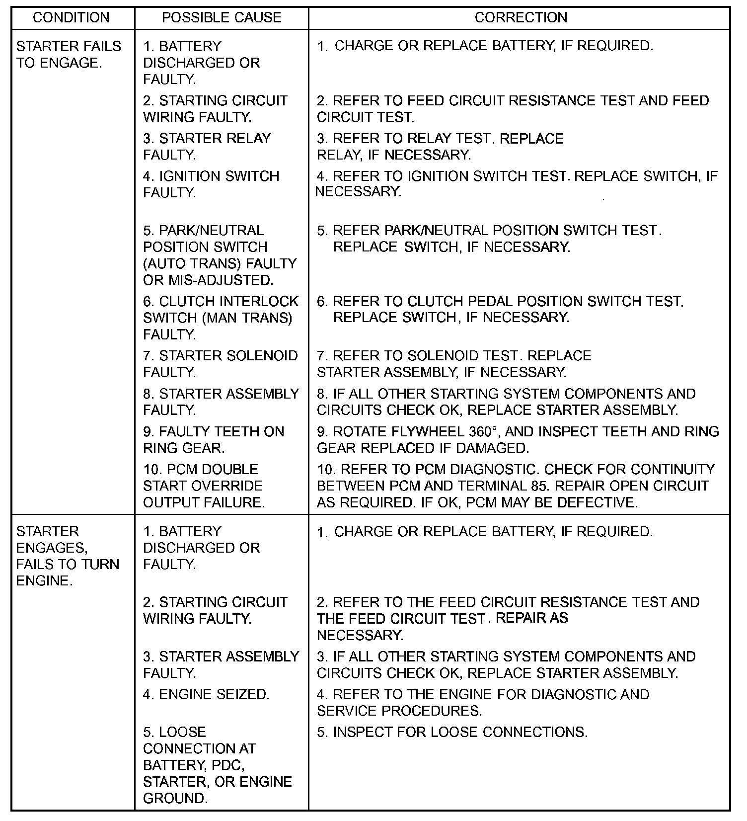 STARTING SYSTEM TESTWARNING: ON VEHICLES EQUIPPED WITH AIRBAGS, REFER TO THE PASSIVE RESTRAINT SYSTEMS BEFORE ATTEMPTING STEERING WHEEL, STEERING COLUMN, OR INSTRUMENT PANEL COMPONENT DIAGNOSIS OR SERVICE. FAILURE TO TAKE THE PROPER PRECAUTIONS COULD RESULT IN ACCIDENTAL AIRBAG DEPLOYMENT AND POSSIBLE PERSONAL INJURY.