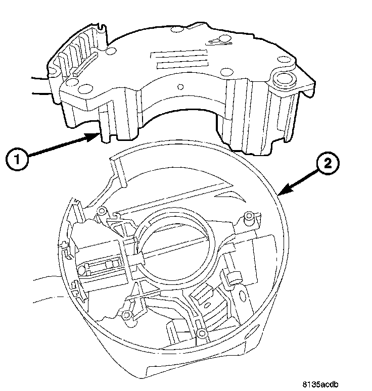 3. If equipped with ESP, remove the steering angle sensor screw located at the six o'clock position on the SCCM and remove the steering angle sensor (1) from the SCCM (2). If not equipped with ESP, there will be a plastic insert there for strengthening of the SCCM that will lift right out.