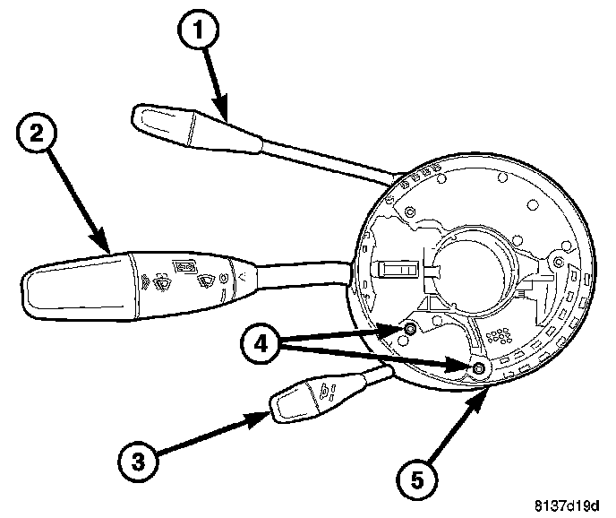 7. Remove the steering column tilt/telescoping lever (3) screw (4) located at the six o'clock position.