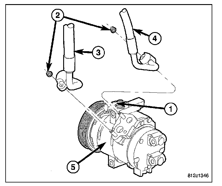 8. Install the suction and discharge lines onto the A/C compressor (5).