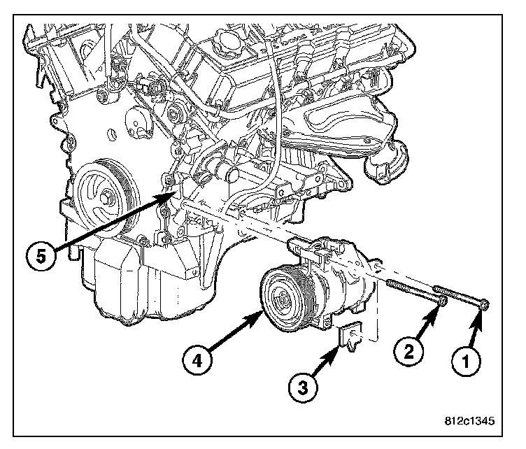 11. Support the A/C compressor (4) and remove the bolts (1 and 2) that secure the automatic transmission cooler line bracket (3) and the compressor (4) to the cylinder block (5).