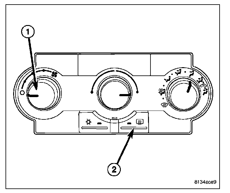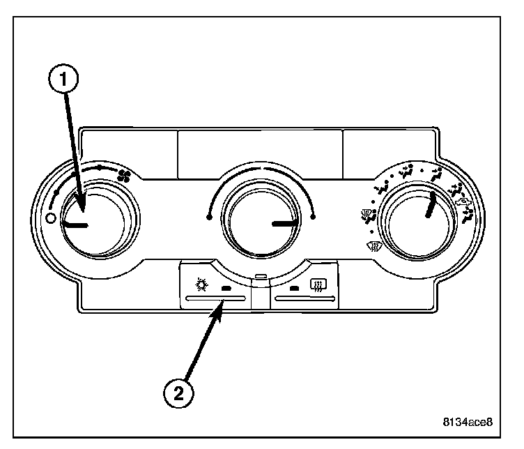4. Press and hold the A/C mode switch (2) down and then turn the blower motor control to high speed. Continue to hold the A/C mode switch down until the A/C status indicator begins flashing, Then, release the mode switch.