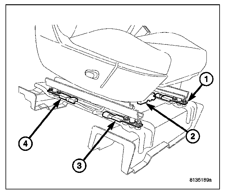 The OCM (2) provides voltage to the four seat weight sensors located on the corners of the passenger front seat (1, 3, and 4), and to the seat track position sensors on the outboard passenger and driver front seat upper seat tracks. The OCM then monitors return inputs from each of the sensors on dedicated hard wired data communication circuits. The seat weight sensor input allows the OCM to determine whether the passenger side front seat is occupied and the relative size of the occupant by providing a weight-sensing reference to the load on the seat. The seat track position sensor provides an additional logic input to the OCM microprocessor that allows it to determine the position of the front seat passenger and driver relative to the front airbags.