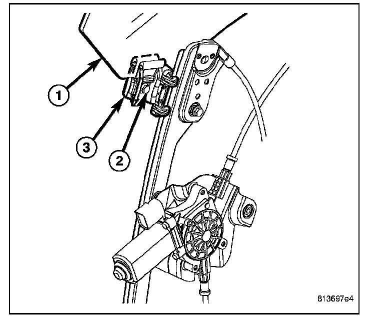7. Using the regulator, adjust the front door glass (1) position up or down as required for access to the two window regulator glass clamps (3).