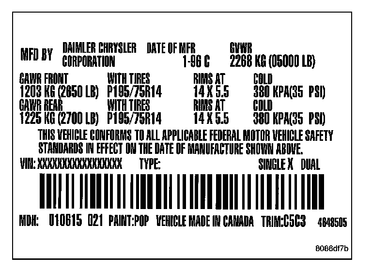 A vehicle certification label is attached to every DaimlerChrysler Corporation vehicle. The label certifies that the vehicle conforms to all applicable Federal Motor Vehicle Standards. The label also lists: