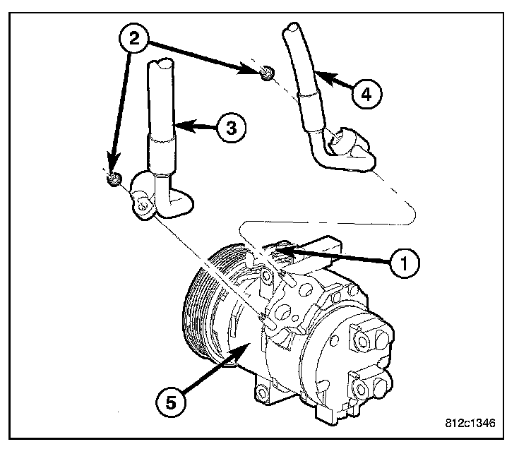 8. Install the suction and discharge lines onto the A/C compressor (5).