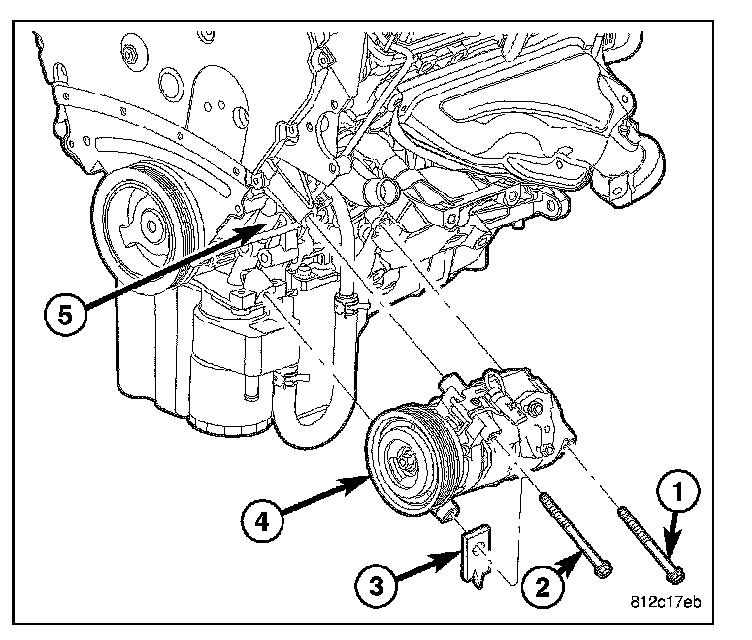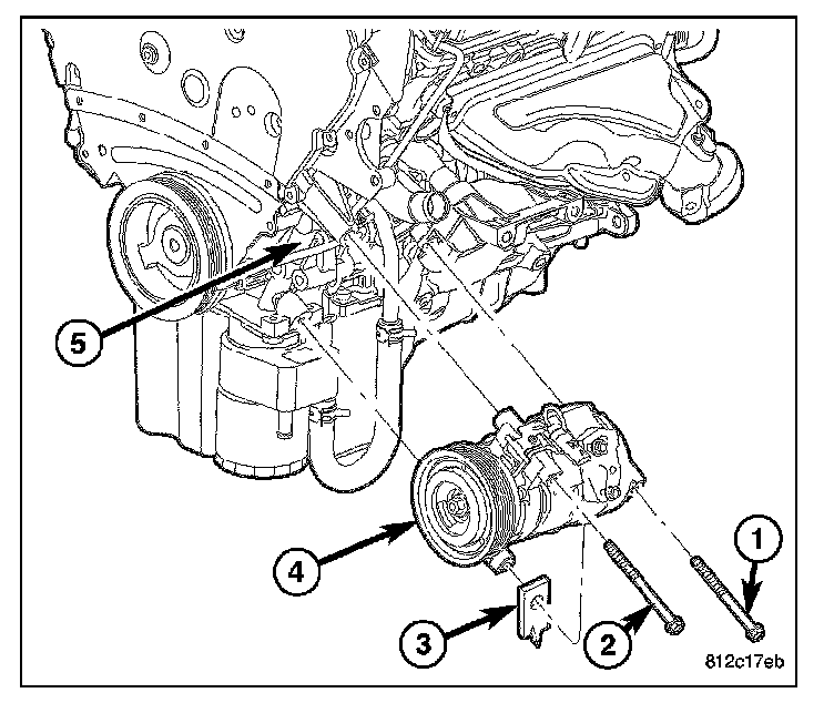 11. Support the A/C compressor (4) and remove the bolts (1 and 2) that secure the compressor and automatic transmission cooler line bracket (3) to the cylinder block (5).
