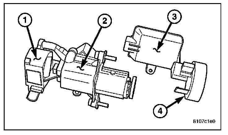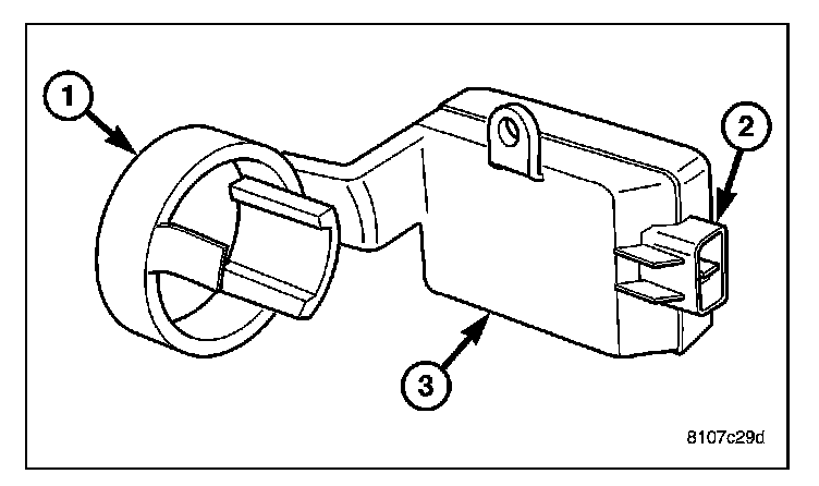 The SKREEM/WCM is located on and around (antenna ring) (4) the ignition key cylinder (2) along with the ignition switch (1). It is accessible only from behind the instrument panel, to the left of the steering column. Serviceability requires lock cylinder removal to access the complete unit.