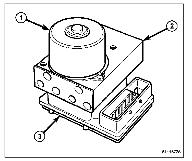 The Antilock Brake Module (ABM) is a microprocessor-based device which monitors the Antilock Brake System (ABS) during normal braking and controls it when the vehicle is in an ABS stop. The ABM also monitors the Electronic Stability Program (ESP) if so equipped. The ABM (3) is mounted to the HCU (2) as part of the Integrated Control Unit (ICU). The ABM uses a 47-way connector on the vehicle wiring harness. The power source for the ABM is through the ignition switch in the RUN or ON position. The ABM is on the CAN-C bus.