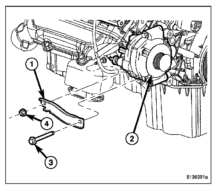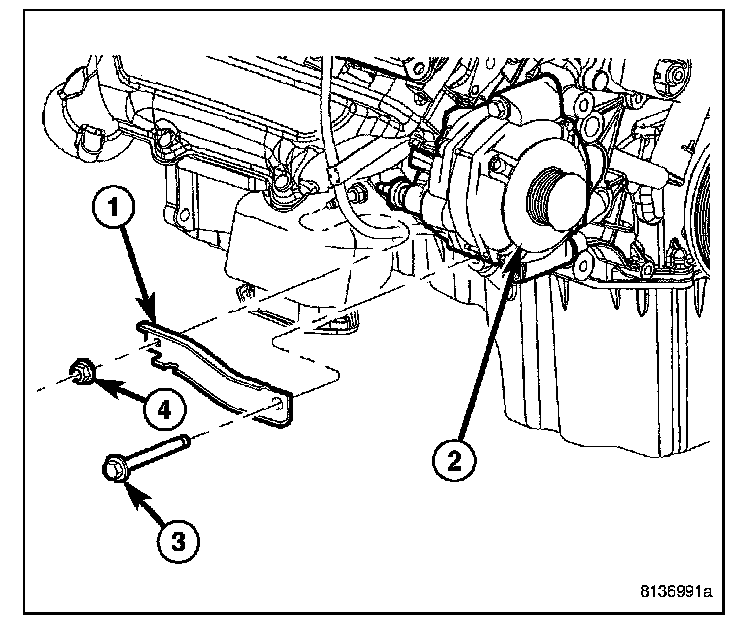 7. Remove generator support bracket nut (4) and bolt (3). Remove support bracket (1).