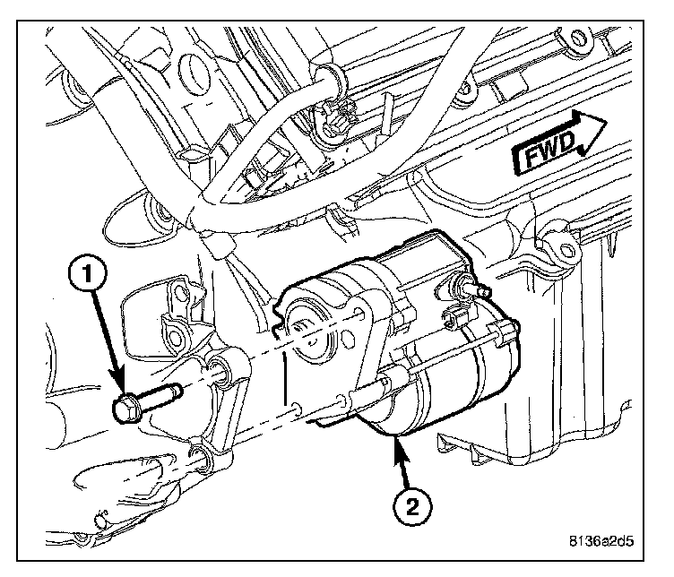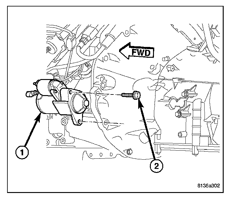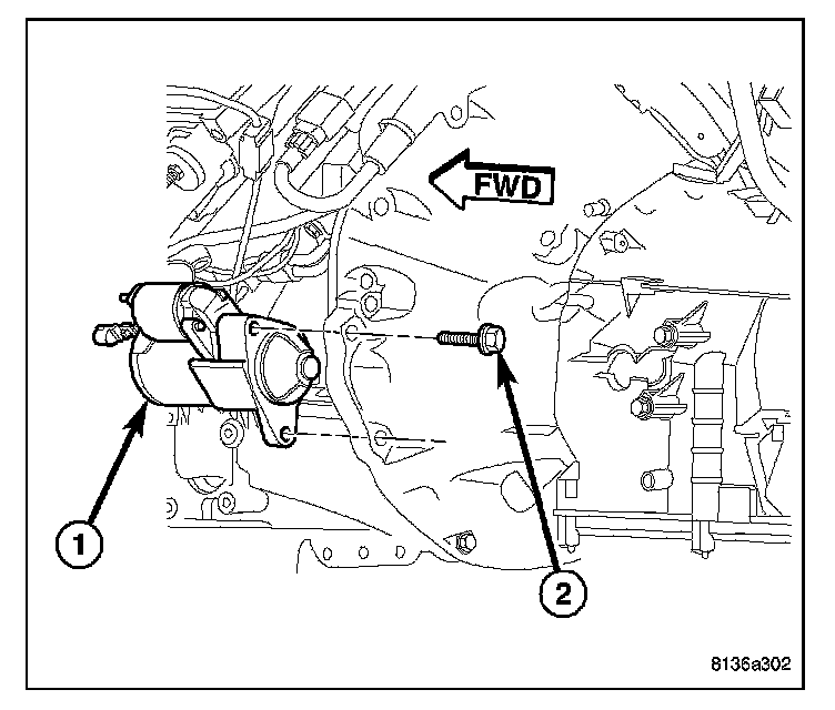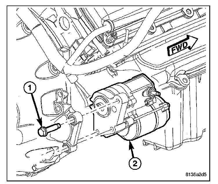 4. Move starter motor (2) towards front of vehicle far enough for nose of starter to clear. Always support starter motor (2) during this process. Do not let starter motor hang from wire harness.