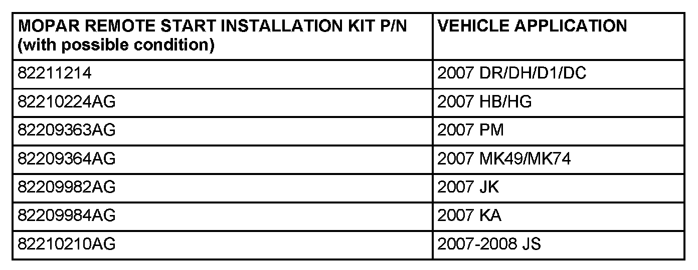 The above condition(s) may be present ONLY if one of the following specific kit part numbers for the Mopar Remote Start Installation Kit had been installed previously on the suspect vehicle.