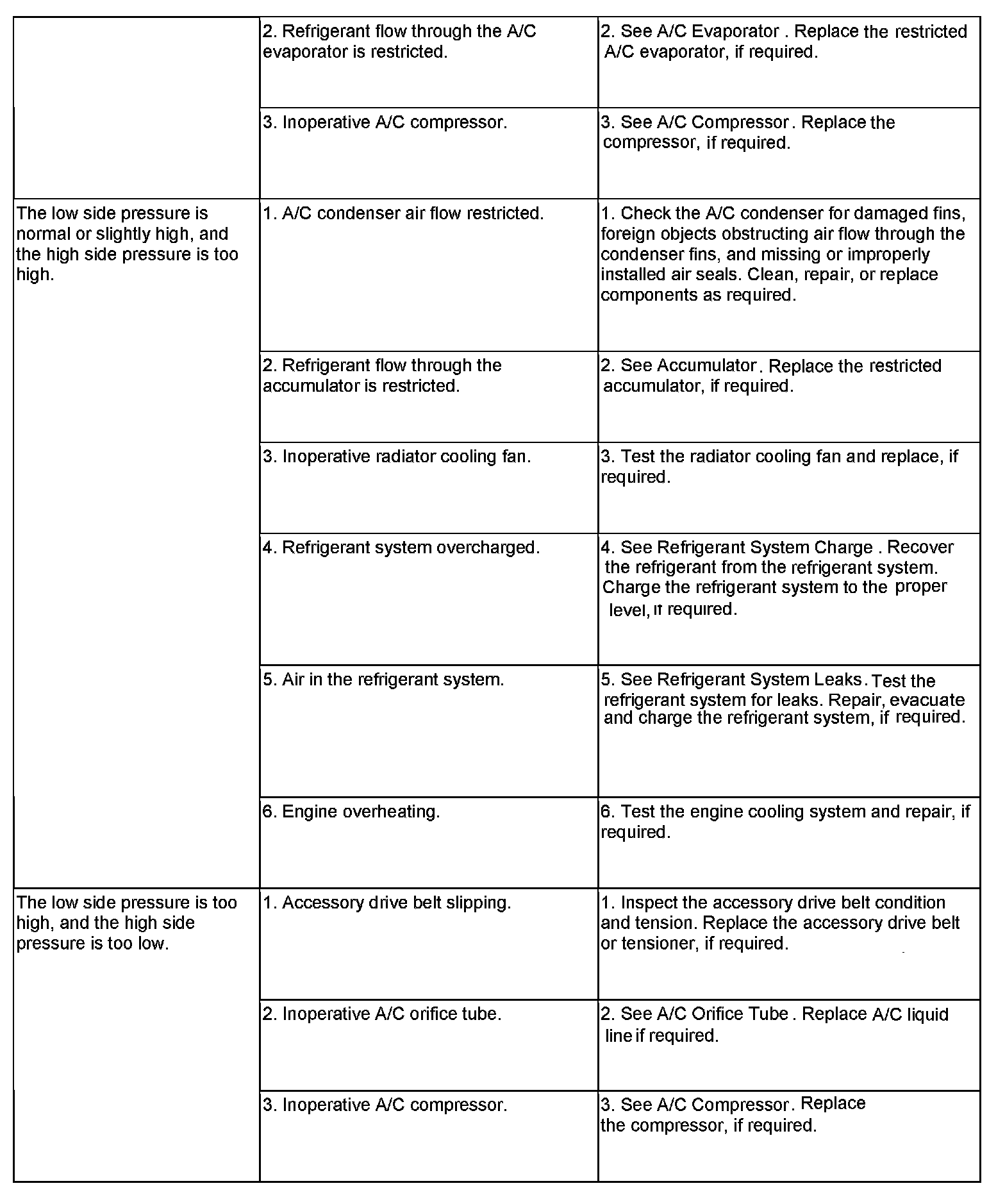 5. Compare the air temperature at the center panel outlet and the A/C system pressures to the A/C Performance Temperature and Pressure chart.