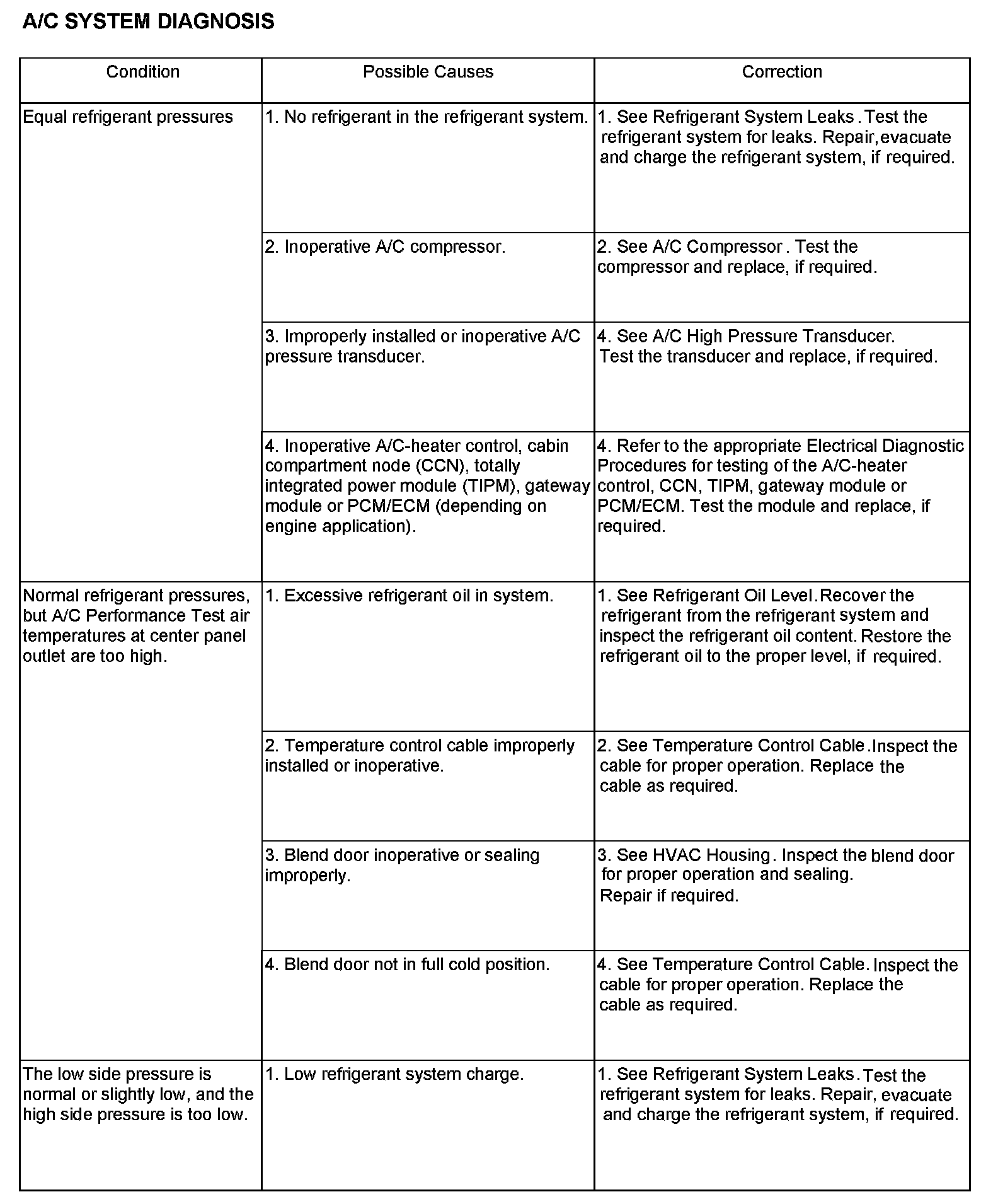 6. If the air outlet temperature or the A/C system pressures are not within specifications, refer to the A/C System Diagnosis chart.