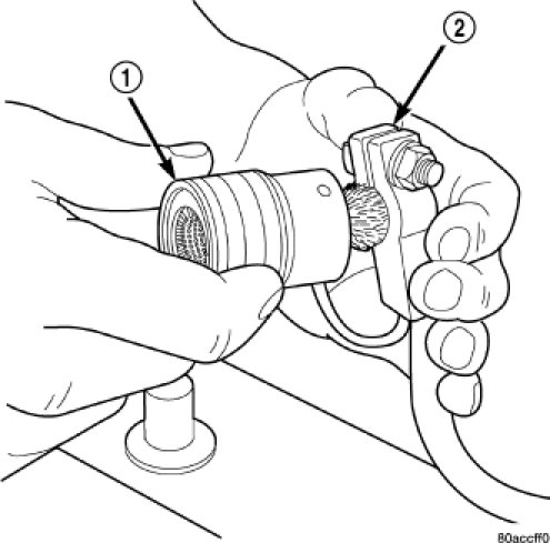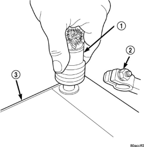 1. Clean the battery cable terminal clamps (2) of all corrosion. Remove any corrosion using a wire brush (1) or a post and terminal cleaning tool, and a sodium bicarbonate (baking soda) and warm water cleaning solution.