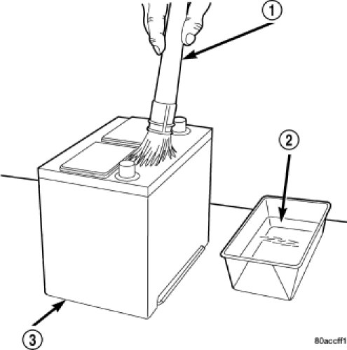 3. If the removed battery is to be reinstalled, clean the outside of the battery case (3) and the top cover with a sodium bicarbonate (baking soda) and warm water cleaning solution using a stiff bristle parts cleaning brush (1) to remove any acid film. Rinse the battery with clean water. Ensure that the cleaning solution does not enter the battery cells through the vent holes. If the battery is being replaced, refer to Battery Specifications for the factory-installed battery specifications. Confirm that the replacement battery is the correct size and has the correct ratings for the vehicle.