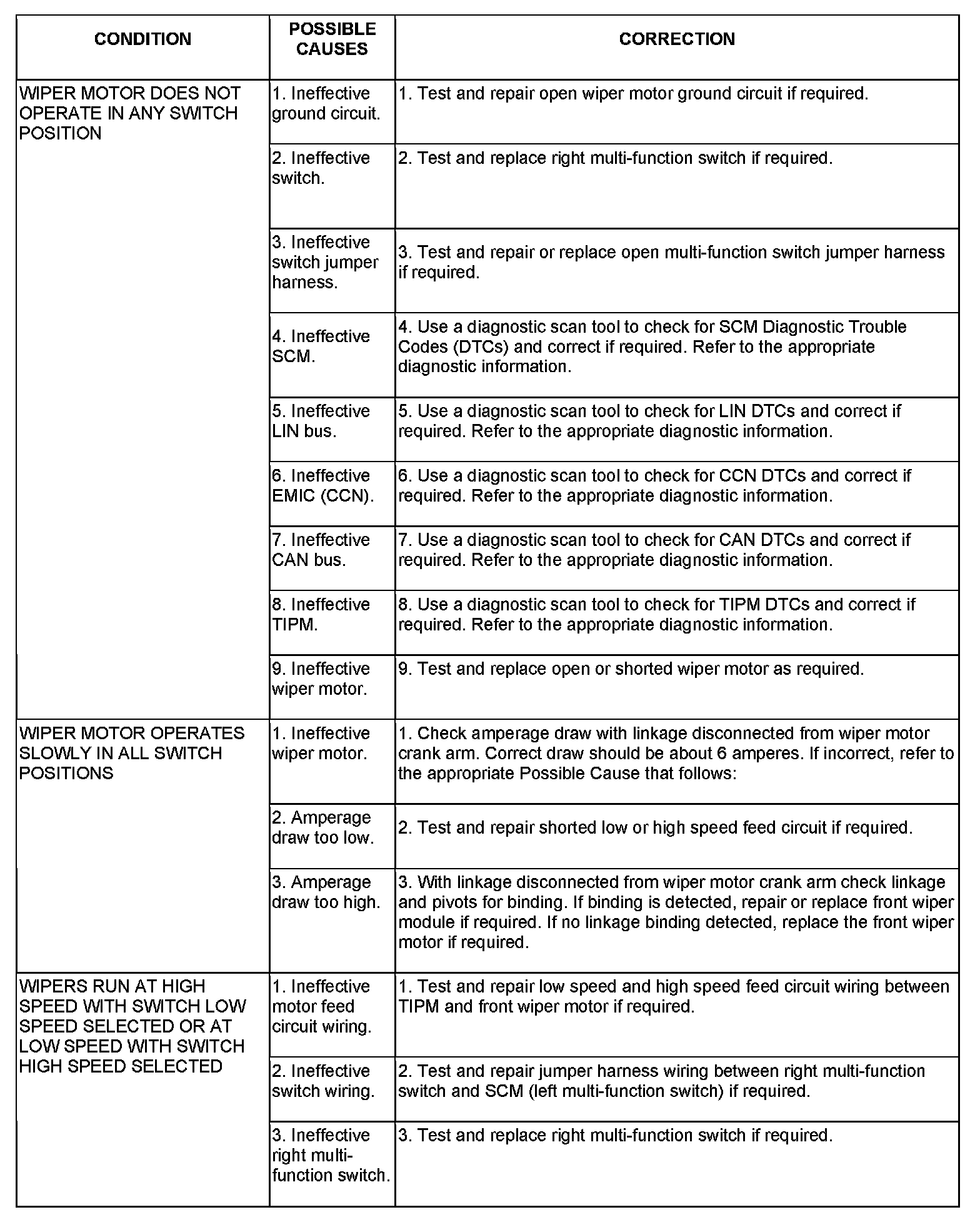 If the front wiper motor operates, but the wipers do not move on the windshield, replace the ineffective front wiper module. If the washer pump/motor operates, but no washer fluid is dispensed on the glass; or, if the wipers operate, but chatter, lift, or do not clear the glass, clean and inspect the front wiper and washer system components as required.