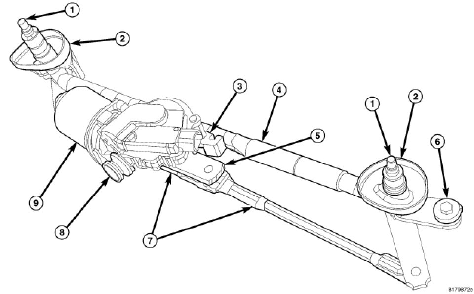 - Pivots - The two front wiper pivots (1) are secured to the ends of the wiper module bracket. The lever arms that extend from the bottom of the pivot shafts each have ballstuds that engage the bushings of the drive links. A molded plastic shield (2) is fit over the top of each pivot housing. The upper end of each pivot shaft where the wiper arms will be fastened each is tapered and serrated with a threaded stud formation at the tip.