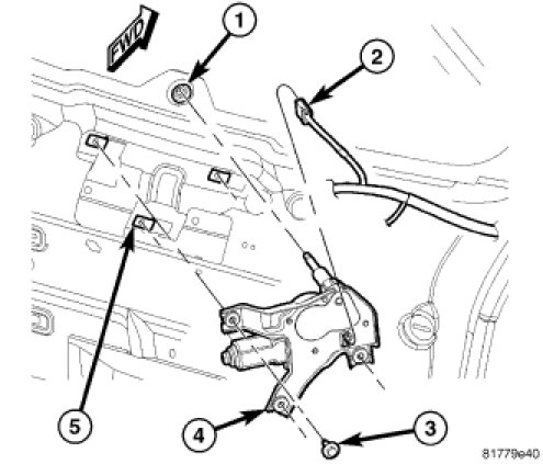 4. Position the rear wiper motor and mounting bracket to the U-nuts (5) in the liftgate inner panel as a unit