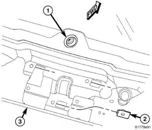 2. Check to be certain that the three U-nuts (2) are properly installed and in good condition in the liftgate inner panel (3).