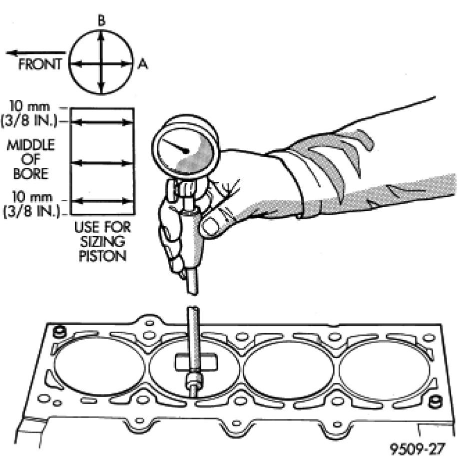 Measure the cylinder bore at three levels in directions A and B. Top measurement should be 10 mm (3/8 in.) down and bottom measurement should be 10 mm (3/8 in.) up from bottom of bore. Refer to - ENGINE - SPECIFICATIONS.