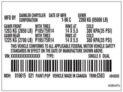 A vehicle certification label is attached to every DaimlerChrysler Corporation vehicle. The label certifies that the vehicle conforms to all applicable Federal Motor Vehicle Standards. The label also lists: