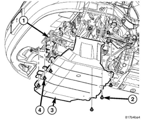 5. Install the three front screws (4), the three rear screws (2) and on push pin fastener into the center of the belly pan.