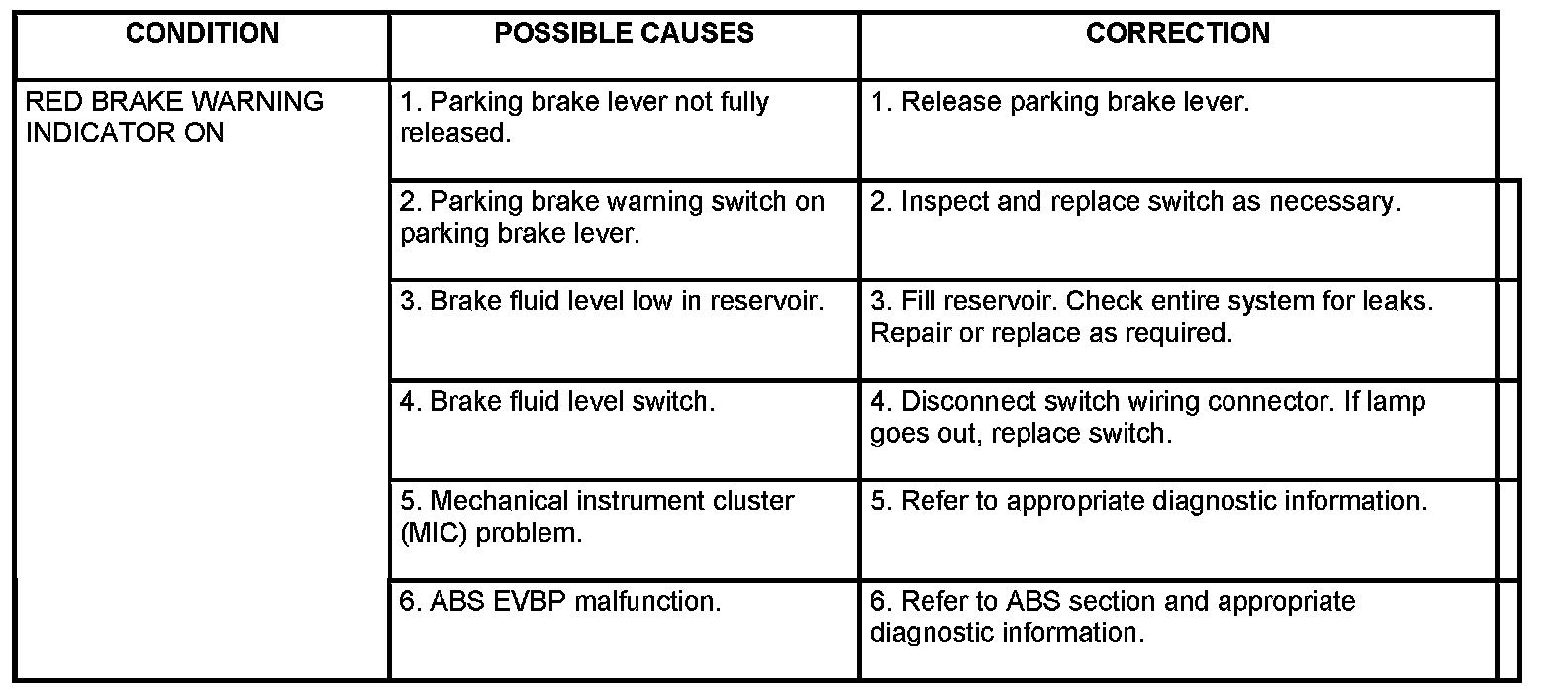 NOTE: There are three diagnosis charts following that cover the RED BRAKE WARNING INDICATOR, BRAKE NOISE and OTHER BRAKE CONDITIONS.