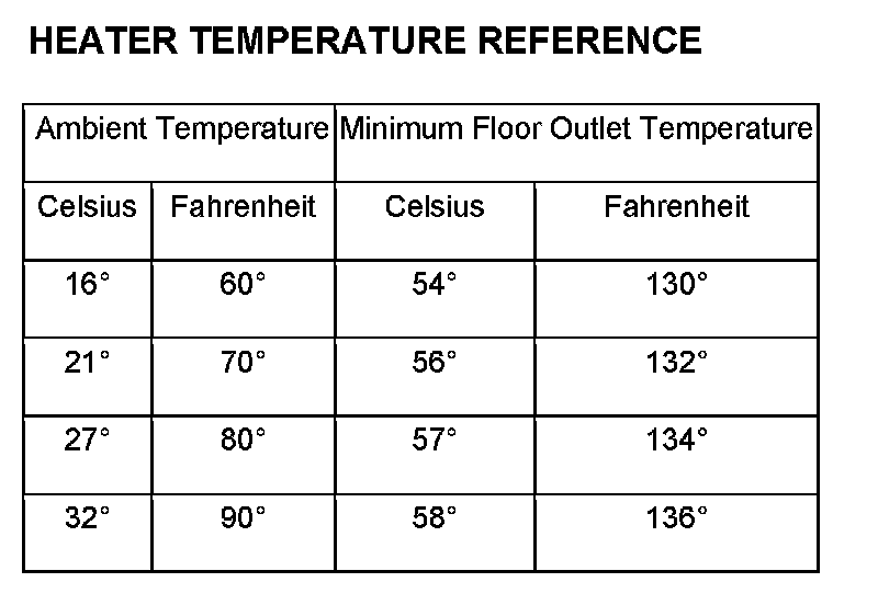 Engine coolant is delivered to and from the heater core through two heater hoses. With the engine idling at normal operating temperature, set the temperature control to the full hot position, the mode control to the floor position, and the blower motor control to the highest speed position. Using a test thermometer, check the temperature of the air being discharged at the front floor outlets. Compare the test thermometer reading to the Heater Temperature Reference chart.