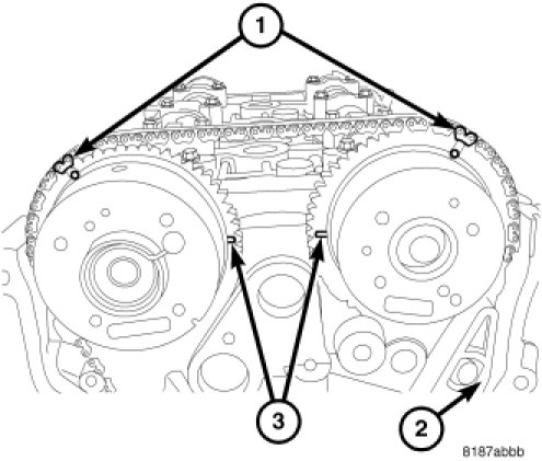 ^ Install timing chain so plated links on chain align with timing marks on camshaft sprockets (1).