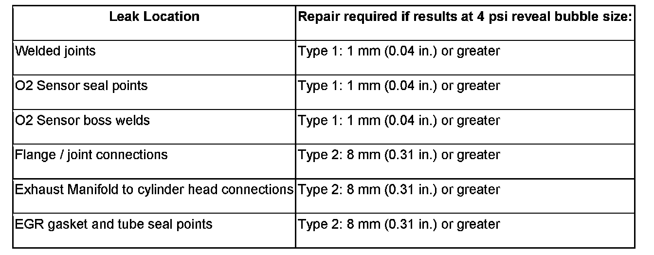 Any Type 2 or greater leaks found in flange or joint connections, exhaust manifold to cylinder head connections, or EGR gasket and tube seal points must be repaired or the components must be replaced