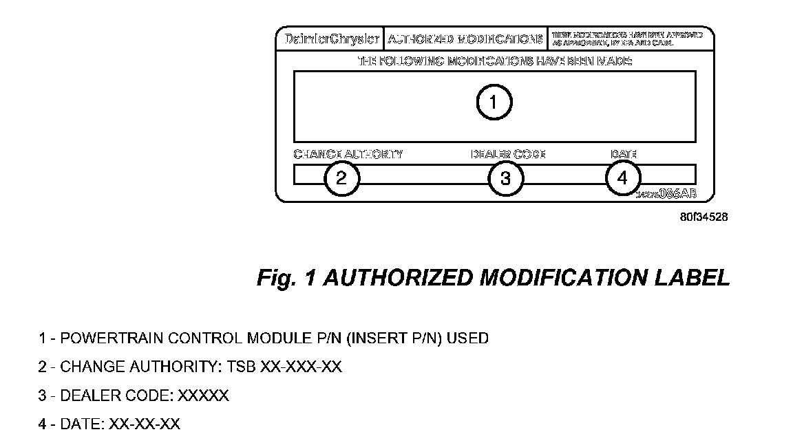 6. Type the necessary information on the "Authorized Modification Label" p/n 04275086AB and attach near the VECI label (Fig. 1).