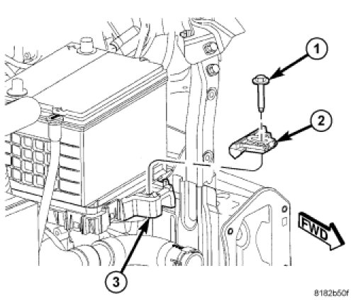 2. Install the battery hold down retainer (2) and bolt (1) making sure that it is properly positioned on battery. Tighten the hold down bolt to 7 Nm (62 in. lbs.)