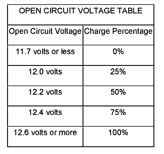 See the Open-Circuit Voltage Table. This voltage reading will indicate the battery state-of-charge, but will not reveal its cranking capacity. If a battery has an open-circuit voltage reading of 12.4 volts or greater, it may be load tested to reveal its cranking capacity.