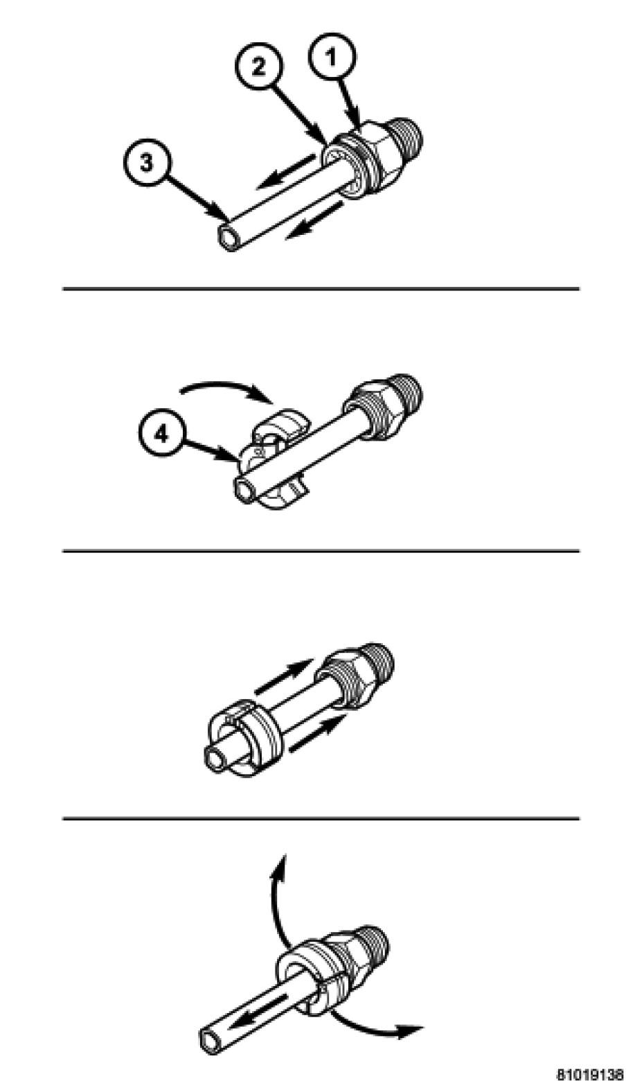 3. Slide dust cap (4) down the transmission cooler line and snap it over the quick connect fitting until it is fully seated and rotates freely. Dust cap will only snap over quick connect fitting when the transmission cooler line is properly installed.
