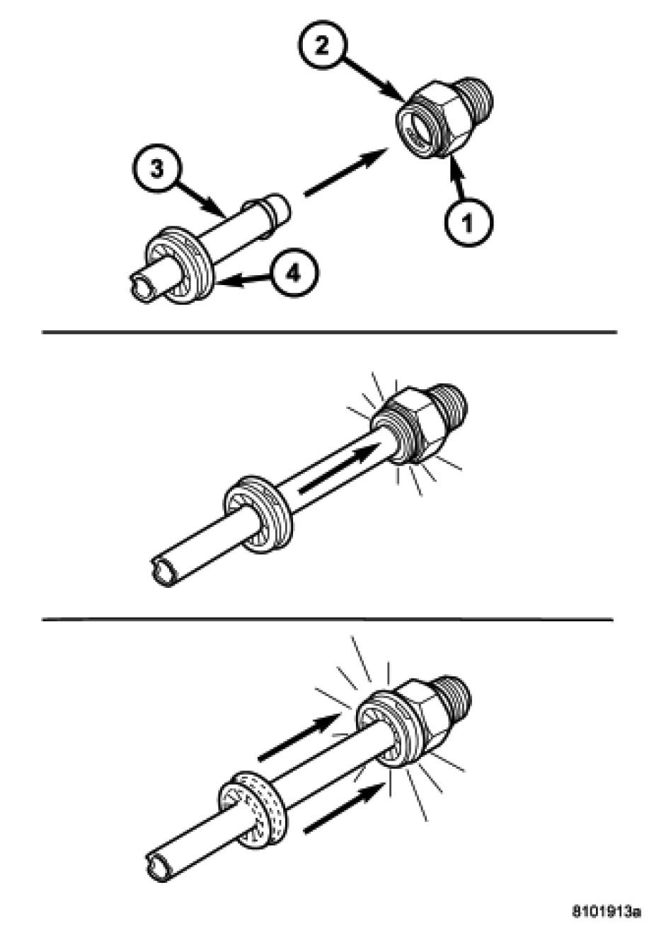 1. Align transmission cooler line (3) with quick connect fitting while pushing straight into the fitting.