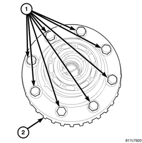 12. Apply MOPAR(R) Lock & Seal Adhesive or an equivalent to the ring gear bolts (1).