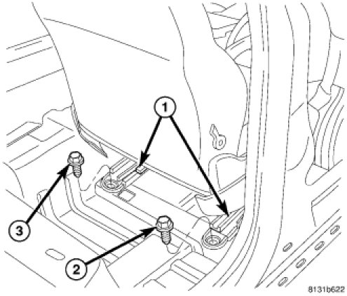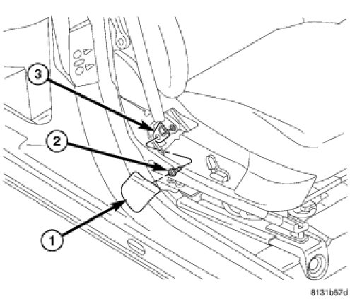 7. Install the cover (1) and lower seat belt anchor bolt (2).