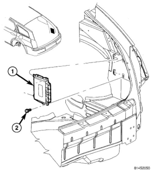 3. Remove the two attaching screws (1) and separate the module (2) from the vehicle.
