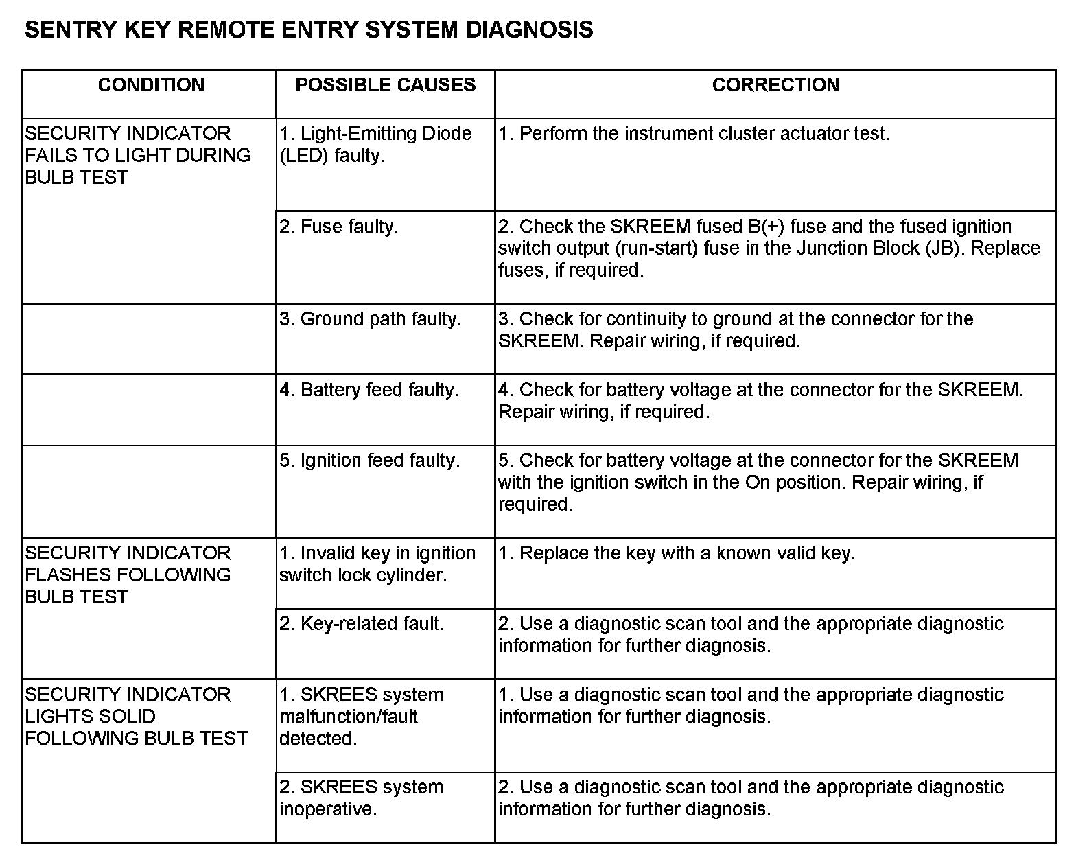 Conventional diagnostic methods may not prove conclusive in the diagnosis of the Sentry Key REmote Entry Module (SKREEM), sometimes referred to as the Wireless Control Module (WCM), and the Sentry Key Immobilizer System (SKIM), sometimes referred to as the Sentry Key Remote Entry System (SKREES), the ElectroMechanical Instrument Cluster (EMIC), the Powertrain Control Module (PCM), the Controller Area Network (CAN) data bus, or the electronic message inputs used to provide the electronic features of the SKREES. The most reliable, efficient, and accurate means to diagnose the SKREEM, the EMIC, the PCM, the CAN data bus, and the electronic message inputs for the SKREES requires the use of a diagnostic scan tool. Refer to the appropriate diagnostic information.