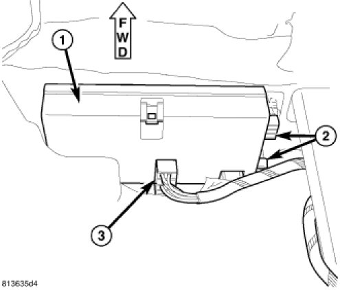 2. Position the retaining clips (2) with the retaining holes (1) in the floor cross member. Firmly apply even pressure to the module (3) until all four retaining clips (2) snap into place.
