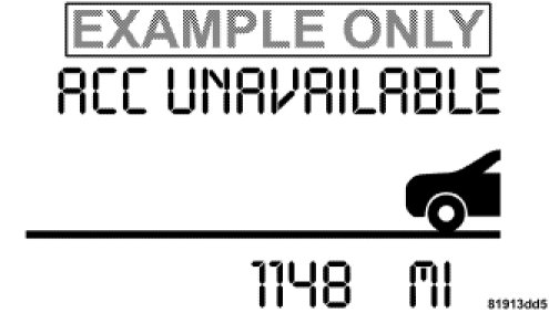 The ACC Unavailable Warning will display when conditions temporarily limit system performance. This most often occurs at times of poor visibility, such as in snow, fog, heavy rain, or when driving into direct sunlight (sunrise or sunset). The ACC system may also become temporarily unavailable due to obstructions, such as dirt or ice. In these cases, the EVIC will display "ACC UNAVAILABLE".