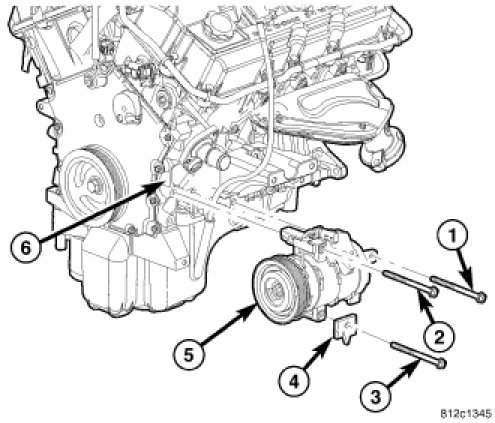 NOTE: The bolt that secures the transmission cooler line bracket to the A/C compressor must be installed through the bracket and the lower front mounting hole of the compressor prior to final positioning of the compressor to the cylinder block.