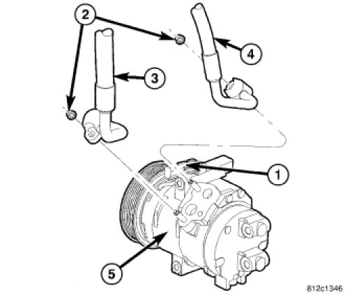 1. If the A/C compressor (5) is being replaced, the refrigerant oil in the old compressor must be first drained and measured. Then the oil in the new A/C compressor must be drained. Finally, the new compressor must be refilled with the same amount of new refrigerant oil that was drained out of the old compressor. When replacing multiple A/C system components, refer to the Refrigerant Oil Capacities chart to determine how much oil should be added to the refrigerant system. Use only refrigerant oil of the type recommended for the A/C compressor in the vehicle.