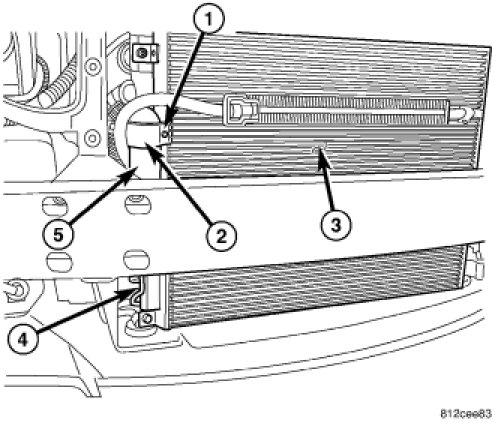 5. Install the bolt (4) that secures the receiver/drier to the A/C condenser. Tighten the bolt to 22 Nm (16 ft. lbs.).
