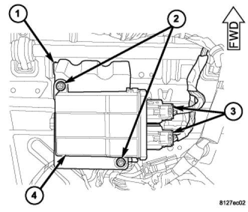 2. Reach under the front edge of the passenger front seat cushion to access and disconnect the two harness connectors (3) from the Occupant Classification Module (OCM) (4).