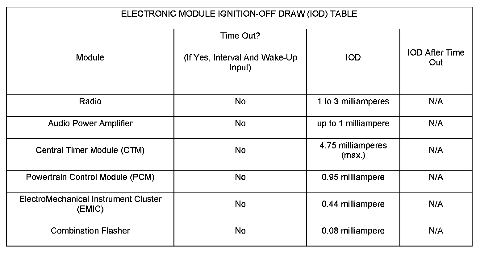 The term Ignition-Off Draw (IOD) identifies a normal condition where power is being drained from the battery with the ignition switch in the Off position. A normal vehicle electrical system will draw from five to thirty-five milliamperes (0.005 to 0.035 ampere) with the ignition switch in the Off position, and all non-ignition controlled circuits in proper working order. Up to thirty-five milliamperes are needed to enable the memory functions for the Powertrain Control Module (PCM), digital clock, electronically tuned radio, and other modules which may vary with the vehicle equipment.