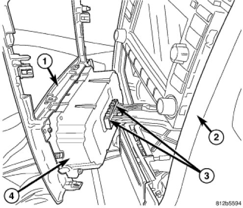 3. Connect the wire harness connector(s) (3) to the A/C-heater control (4) and install the instrument panel center bezel (1) to the instrument panel (2).
