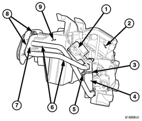 1. Carefully install the heater core (4) into the driver side of the HVAC air distribution housing (2) and position the heater core tubes (6) to the HVAC housing (9).