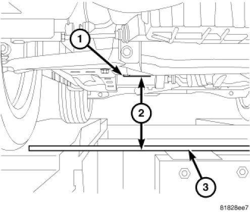2. FRONT - On each side of the vehicle, measure the distance (2) from the lower control arm rear (vertical) pivot bolt head (1) to the floor or alignment rack/lift runway surface. It may be necessary to measure to the bottom of a straight edge (3), placed from lift runway to runway, to get an accurate measurement.
